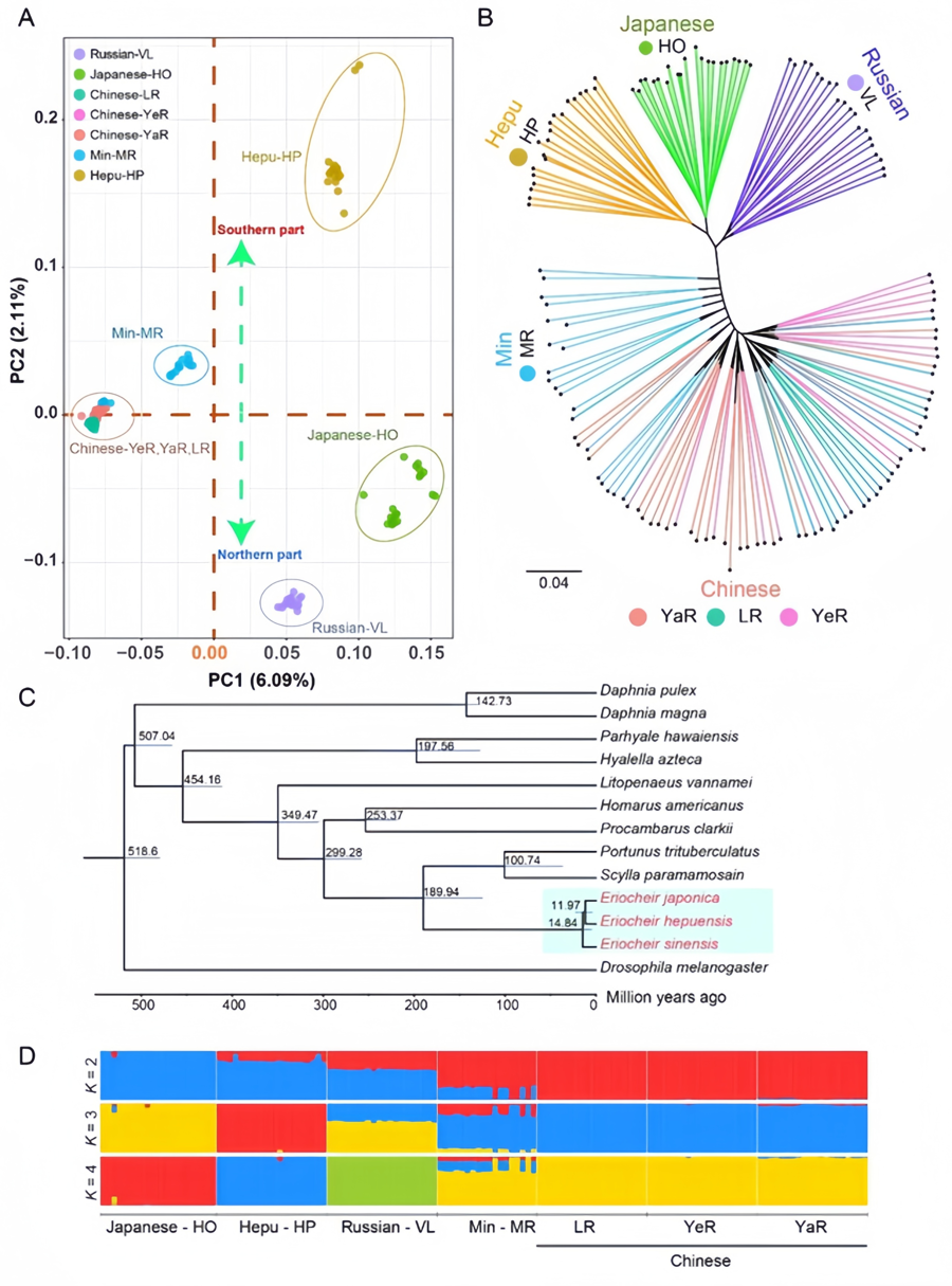 为揭开这一谜题,上海海洋大学联合国内外科研机构,展开了跨越大半个东亚的“寻亲之旅”。他们收集了绒螯蟹属的7个不同地理种群,共139个个体,运用综合表型性状评价与群体基因组学解析等手段,揭秘了绒螯蟹属的“族谱”。