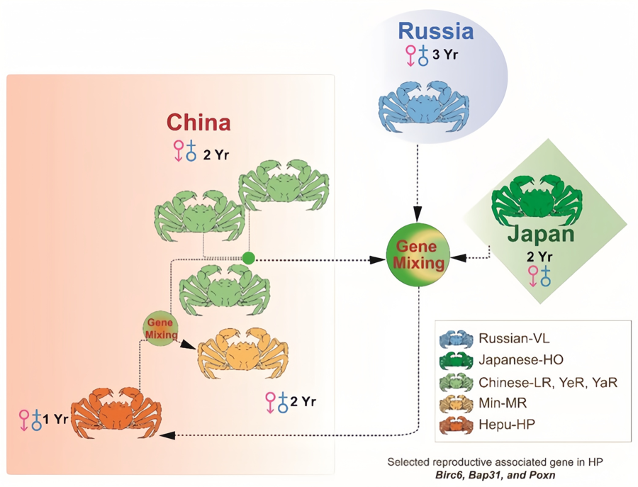研究发现,中华绒螯蟹与日本绒螯蟹约1484万年前分化为两个物种。“分家”后,在绒螯蟹属的演化过程中,两种绒螯蟹向南北两个方向扩散和杂交,分别产生了南方的合浦绒螯蟹和北方的北亚绒螯蟹两个杂交群体。后者主要分布在俄罗斯海参崴水域,处于野生状态。