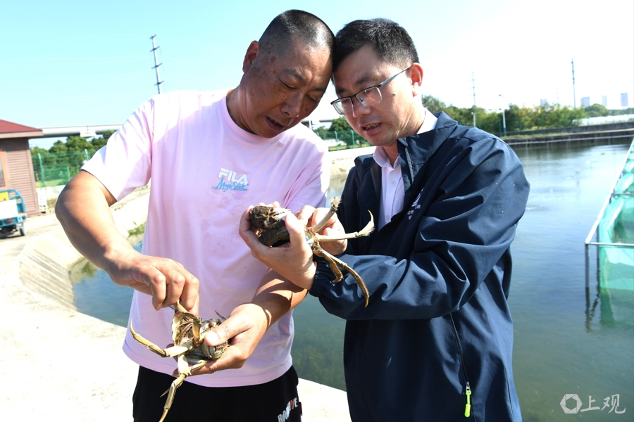 上海海洋大学王成辉教授(右)与养殖户观察大闸蟹长势 摄影记者 徐程