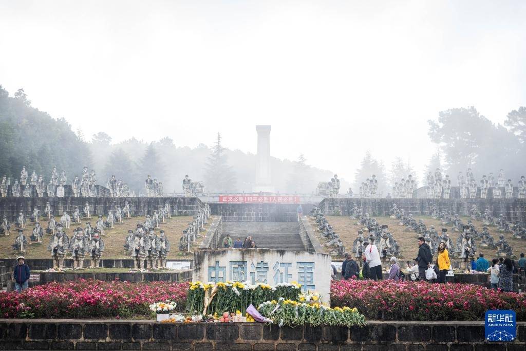 11月20日,游客在云南省保山市龙陵县松山战役旧址参观时向娃娃兵雕像敬献糖果。